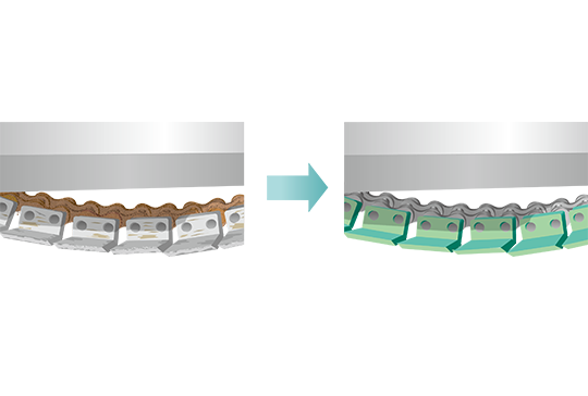 ベースチェーンをつばきが独自に開発した特殊コートと特殊樹脂コートを組合せた高い耐食性(防錆性)と耐薬品性のあるNEP仕様に変更することで、錆びにくくなり、チェーンの長寿命化を実現し、チェーン交換頻度も減らすことができました。