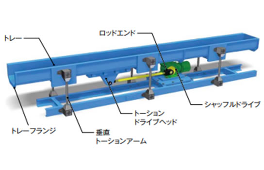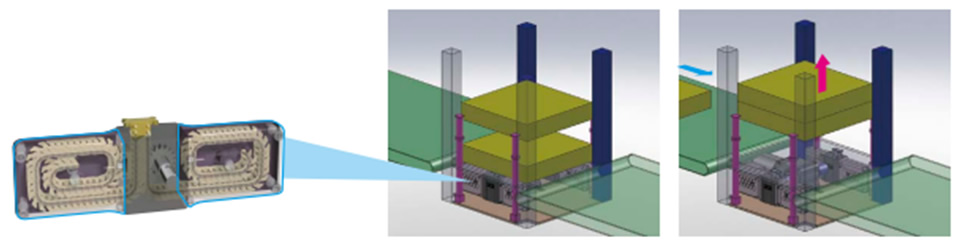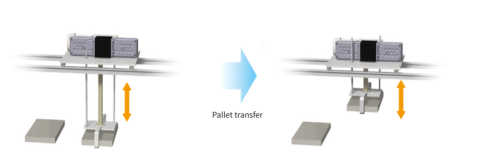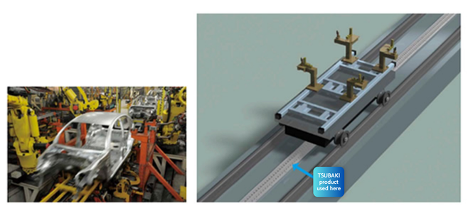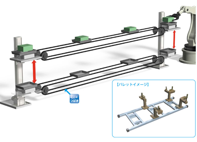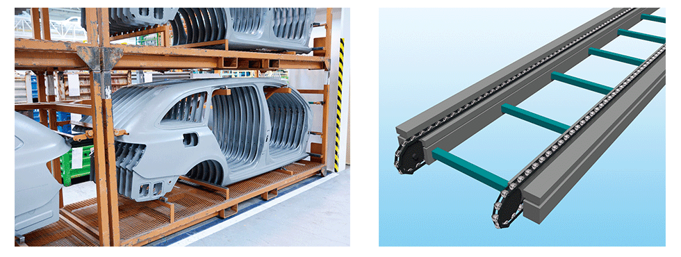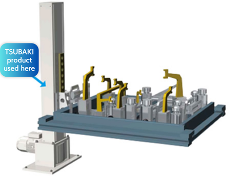 바디를 용접하는 공정 사이에는 갠트리 로더나 로봇에 의한 부재의 반송 설비가 있어, 거기에서의 부재 전달의 택트 타임 단축을 도모하기 위해 짚 체인 리프터가 사용되고 있습니다. 고속 승강이 가능하고, 또한 위치결정 정밀도도 높기 때문에 다른 반송 설비와 조합도 가능합니다.