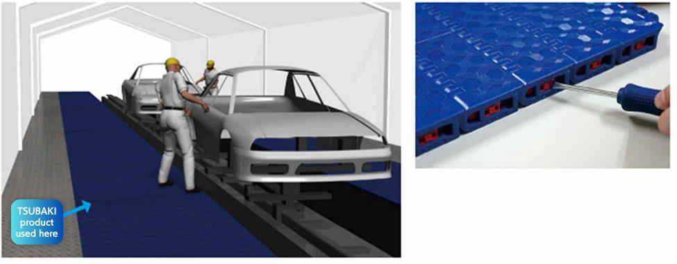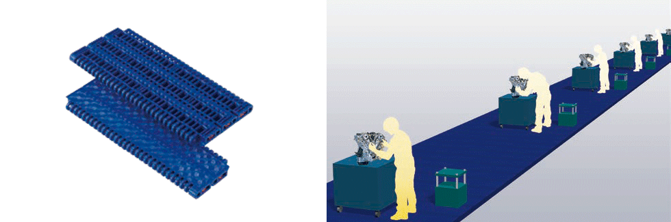 최종 검사 공정에서 점검을 수행하는 작업자와 차량을 함께 운반하는 컨베이어에 플라스틱모듈러체인 사용되고 있습니다. 플라스틱모듈러체인은 부품 수리가 가능하므로 유지보수성이 향상됩니다.