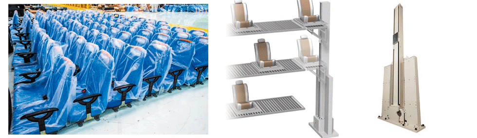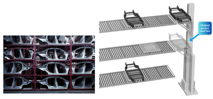 차체에 조립되는 부품은 그 차체마다 팔레트로 관리됩니다. 조립 순서 대기의 팔레트를 체류시키는 간이 스토커에 수납하는 리프터에 리프트마스터가 사용되고 있습니다.
