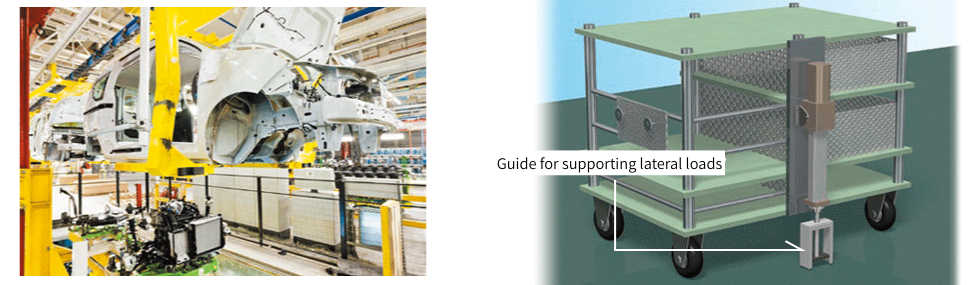 조립 후의 몸체를 다음 공정 대차에 적재하는 이재 설비에도, 횡하중에 강하고, 긴 수명의 리프트마스터가 사용되고 있습니다.