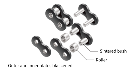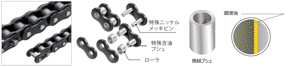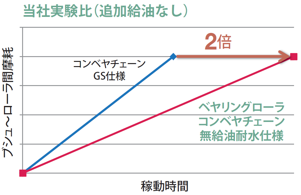 이 체인은, 롤러에 원통 베어링를 넣은 독자적인 구조에 의해 덜컥거리는 현상의 억제에 가세해, 고효율화, 코스트 다운, 롤러 레일의 장수명을 실현할 수 있습니다.