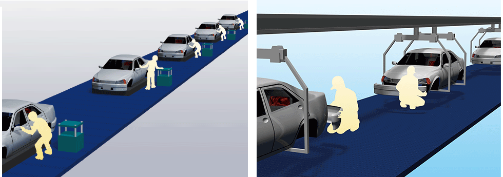 좌우 2개의 리프트마스터로 차체를 승강시킴으로써 작업성을 확보합니다. 또, 생산 차체의 변경에 의한 설비 변경도 최소화할 수 있습니다.