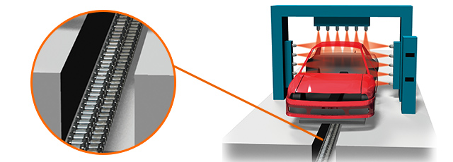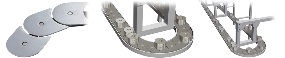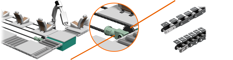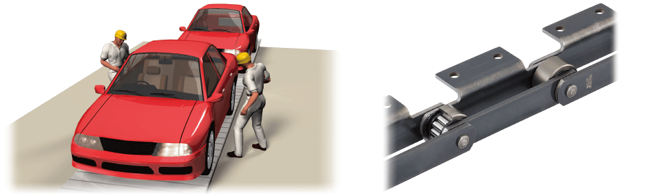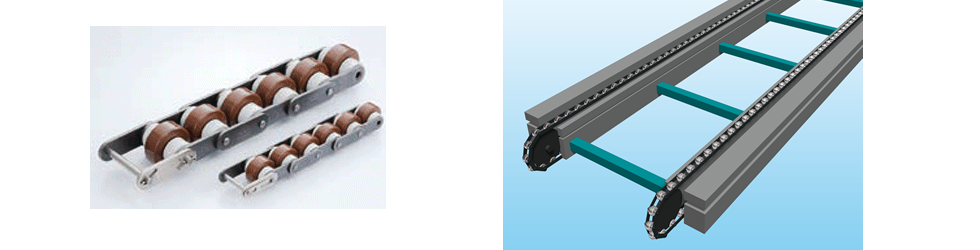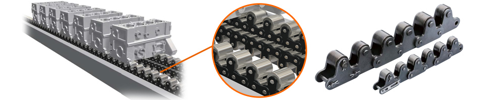 부품 가공, 검사 라인에서는 부품에 흠집이 생기지 않도록 플라스틱 체인이나 반송면에 롤러를 내장한 어큐뮬레이션 체인이 사용되고 있습니다.