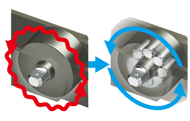 스틸 롤러에 특수함유 베어링을 삽입한 롤러로 무급유로 사용이 가능합니다. 스틸 롤러를 급유하지 않고 사용했을 경우의 이음의 대책을 할 수 있습니다. 사내 시험 조건에서 대 스틸비 약 10dB 저감했습니다.