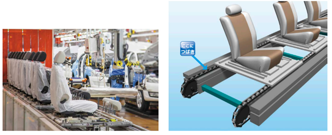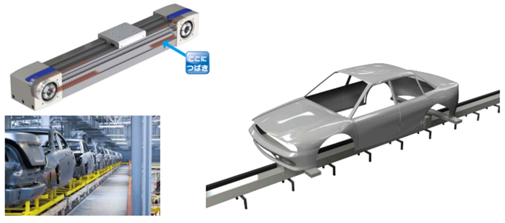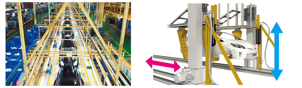 오버헤드 컨베이어로 매달린 차체에 엔진이나 리어 서스를 탑재하는 설비가 있습니다. 높은 위치결정 정밀도가 요구되는 이 공정에서는 유압 리프터에 비해 정지 정밀도가 뛰어나고 고속 승강이 가능한 짚 체인 리프터가 사용되고 있습니다.