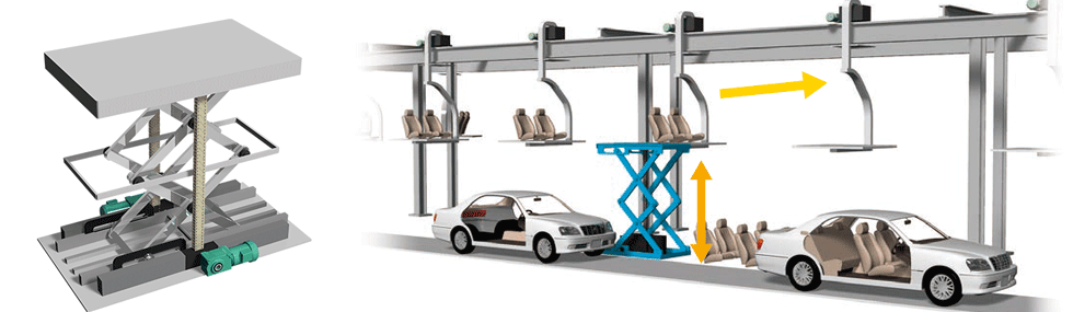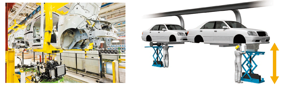 차체 프레임이나 도어 등의 부품을 용접 조립하는 라인이나, 배입출하는 워크의 승강 장치에, 저상에서 컴팩트 설계의 리프트마스터가 사용되고 있습니다. 저층 사양에 대한 자세한 내용은 당사에 문의하십시오.