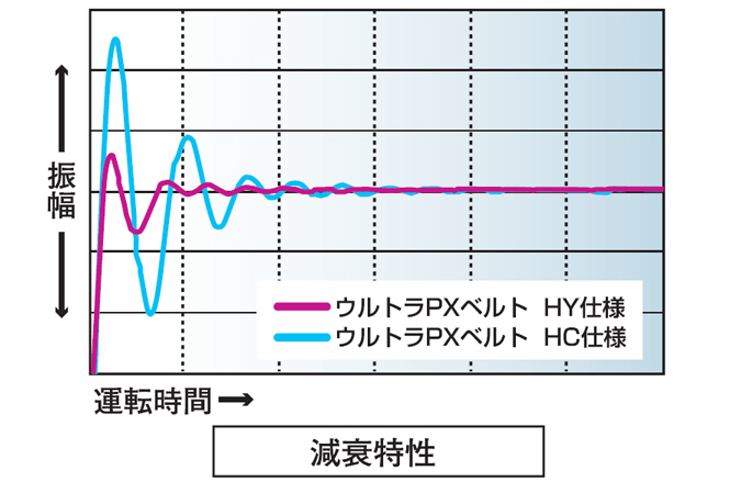 울트라 PX 벨트 HY사양은, 유리와 카본의 하이브리드 심선의 채용 등에 의해, 대폭적인 고강도화와 고강성화를 실현한 벨트입니다. 종래품 HC사양 비 약 1.3~2.0배의 전동능력 향상을 실현. 이렇게하면 장치의 크기를 줄여 컴팩트화할 수 있습니다.