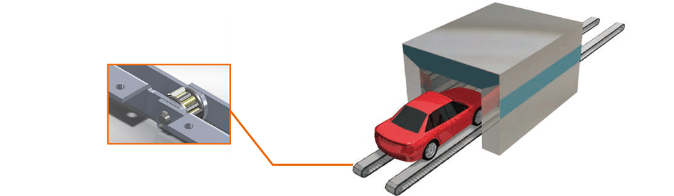 차량을 적재한 대차를 작업 공정에 고정하기 위해, 대차에 전동식의 파워실린더가 사용되고 있습니다. 소비 전력을 억제할 수 있어 대차의 한정된 작은 공간에 설치가 가능합니다.