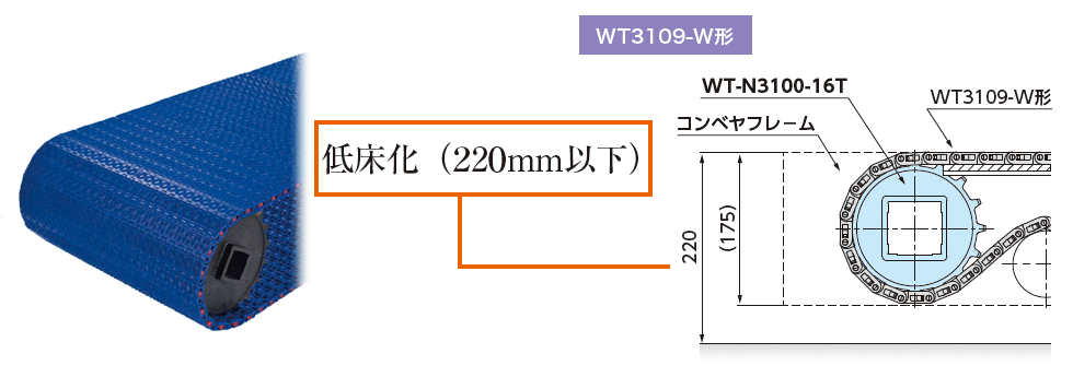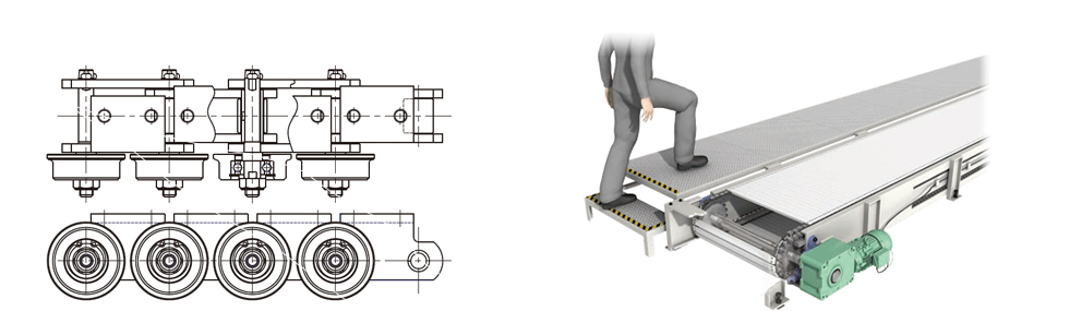 종래의 컨베이어 체인에서는 피트를 파고 컨베이어를 설치할 필요가 있었습니다만, 체인을 쇼트 피치화하는 것으로 저층의 컨베이어가 가능해져, 피트를 파지 않고, 컨베이어를 바닥면에 설치하는 것으로, 설치 공기의 단축을 실현했습니다.