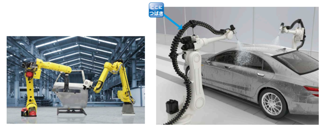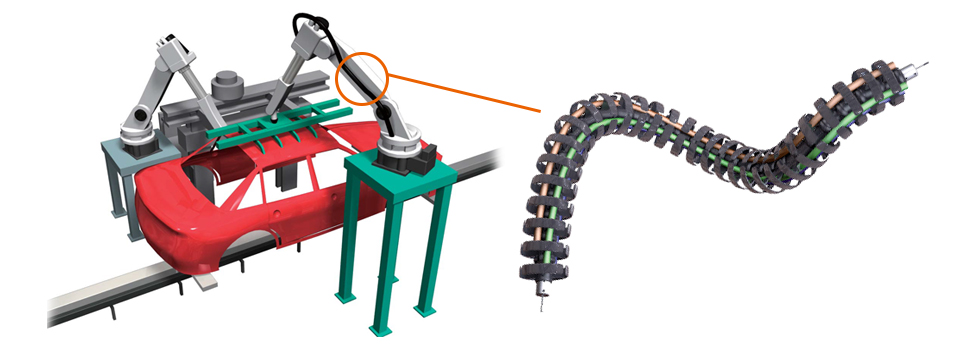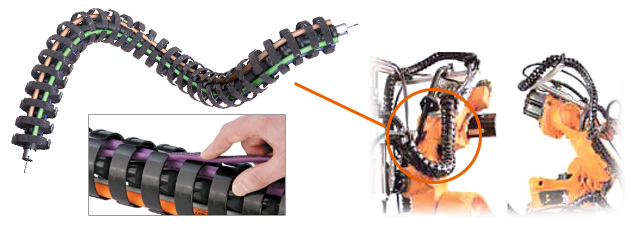 차량의 검사 공정에서도 로봇의 도입이 진행되고 있으며, 그 로봇 암에 3 차원으로 움직이는 케이블 베이어 ROBOTRAX가 사용되고 있습니다. ROBOTRAX는 오픈 구조로 링크 측면의 슬릿에 케이블을 밀어넣어 삽입할 수 있어, 메인터넌스 작업도 용이하게 실시할 수 있는 케이블 베이어 입니다.
