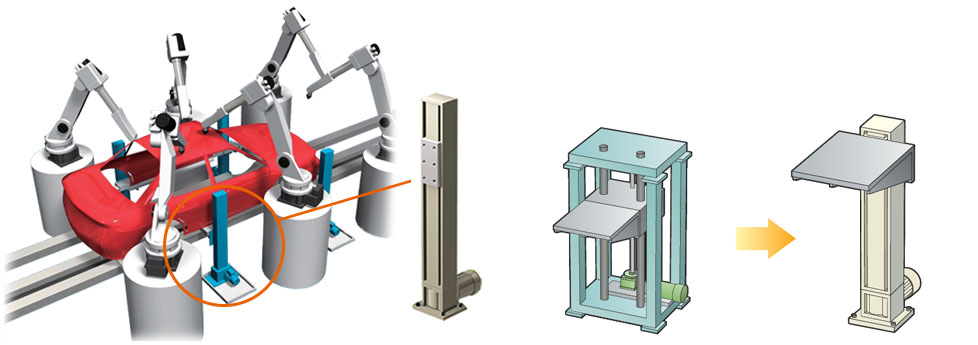 프레스 전후에 있는 공급 부재의 유지·승강 용도에서는 복수대를 연동시킨 잭이 사용되고 있습니다. 기존의 리니파워잭 뿐만 아니라 리니스피드잭을 채용하여 고속 · 고주파 운전도 가능합니다.