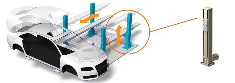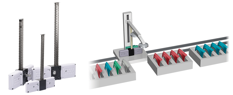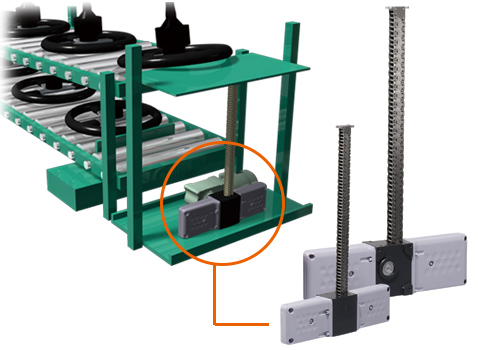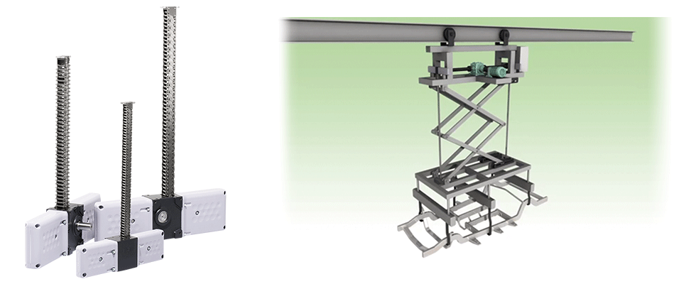 부품을 매달는 갠트리 로더 등의 장치에 공간 절약으로 설치 가능한 짚 체인 액추에이터가 사용되고 있습니다. 또한 고속 승강도 가능하며 사이클 타임 단축에도 기여합니다.