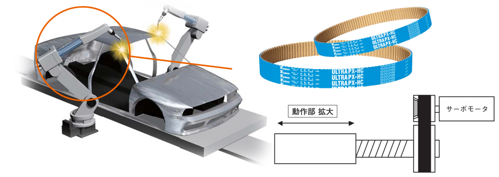 용접 전극을 움직이는 건의 용도에는 깨끗한 전동 기구가 요구되기 때문에, 고강도・컴팩트한 전동 장치로, 한편 그리스나 기름의 비산이 없는, 츠바키 타이밍 벨트 울트라 PX 벨트 HC사양 사용되고 있습니다.
