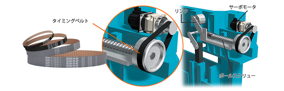 연속 가동으로 고빈도의 충격 부하가 있는 서보 프레스에서 요구되는 벨트는 고강성, 고강도가 필요합니다.