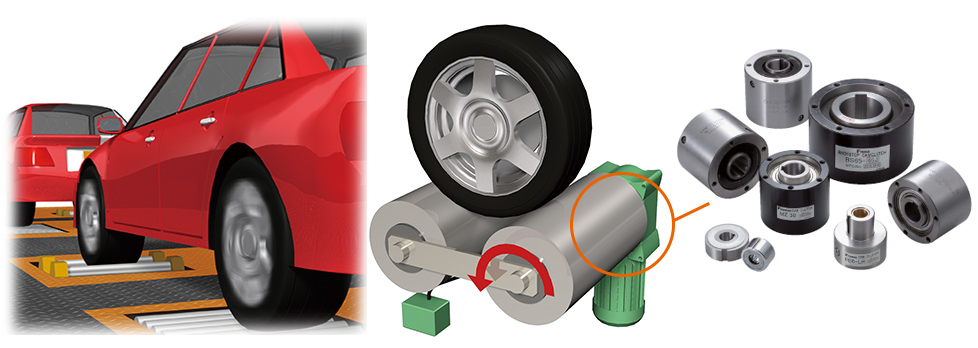 엔진 브레이크 테스터의 롤러 구동용으로 원웨이 클러치 내장 감속기가 사용되고 있습니다.