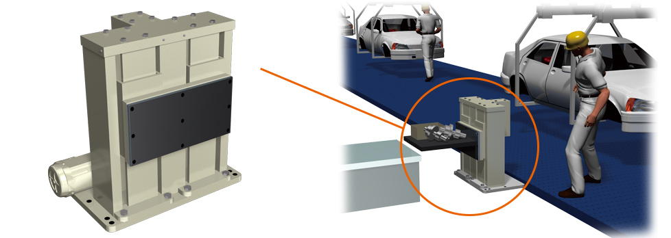 용접 지그를 반송하는 마찰 방식의 대용으로서 핀기어드라이브유닛이 사용되고 있습니다. 핀 기어에 의한 맞물림 구동이면, 가공유 등이 부착되어도 확실하게 반송할 수 있으므로, 반송 택트 타임 단축에 공헌할 수 있습니다.