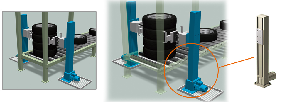 시트 등 내장 부품은 팔레트에 적재되어 조립 공장에 반입됩니다. 이 반입 부품을 조립 라인까지 공급하는 롤러 컨베이어로 분배하기 위한 다단 위치 결정의 설비에 고속·고주파수·고정밀도로 승강 가능한 짚 마스터가 사용되고 있습니다. 두고 폰식 설비 때문에, 짧은 공기에서도 설치 가능하고 스피디한 현장 개선이 가능합니다.
