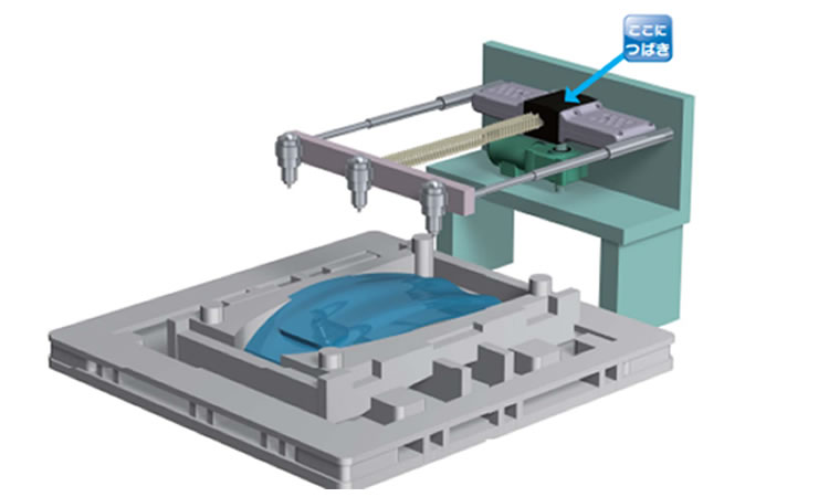 프레스 금형에 가공유를 분사하는 노즐구의 횡행에 짚 체인 액추에이터가 사용되고 있습니다. 좁은 공간에 설치가 가능하고 컴팩트하고 고속 횡행을 실현하고 있습니다.