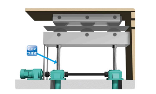 반송물을 쌓는 승강 기구에 짚 체인 액추에이터가 사용되고 있습니다. 한없이 저층 리프터 제작의 요망에 대해, 피트를 파지 않고 장스트로크의 승강을 실현할 수 있습니다.