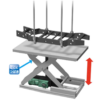 공간 반송에 사용되는 갠트리 로더의 승강 기구에, 공간 절약으로 설치 가능한 짚 체인 액추에이터가 사용되고 있습니다. 상하의 승강에 에어 실린더를 사용했을 경우와 비교해, 실린더 본체가 천정측으로 돌출하지 않기 때문에, 천정을 낮게 할 수 있습니다.