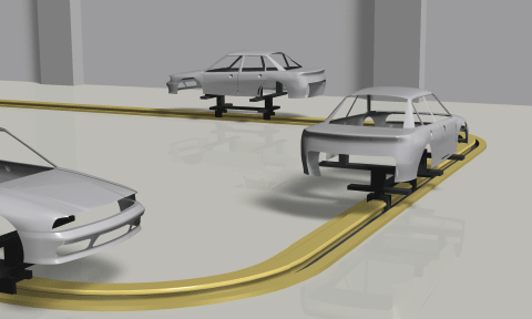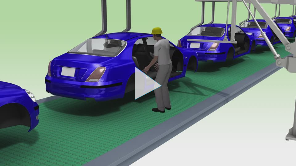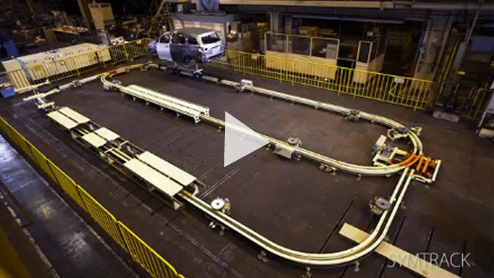 부지를 효과적으로 활용하기 위해 도어와 시트는 차체 반송 컨베이어와 별도로 공정 상단에서 공급될 수 있습니다. 상부에서 차체로 내리는 공정으로 부드럽고 고속 승강이 가능한 짚 체인 리프터가 사용되고 있습니다.