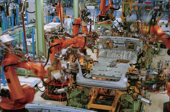 프레스 공정으로 완성된 부품을 많은 다축 로봇에 의해 차체에 조립해 나가는 공정입니다. 용접 작업의 대부분은 기계로 자동화됩니다.
