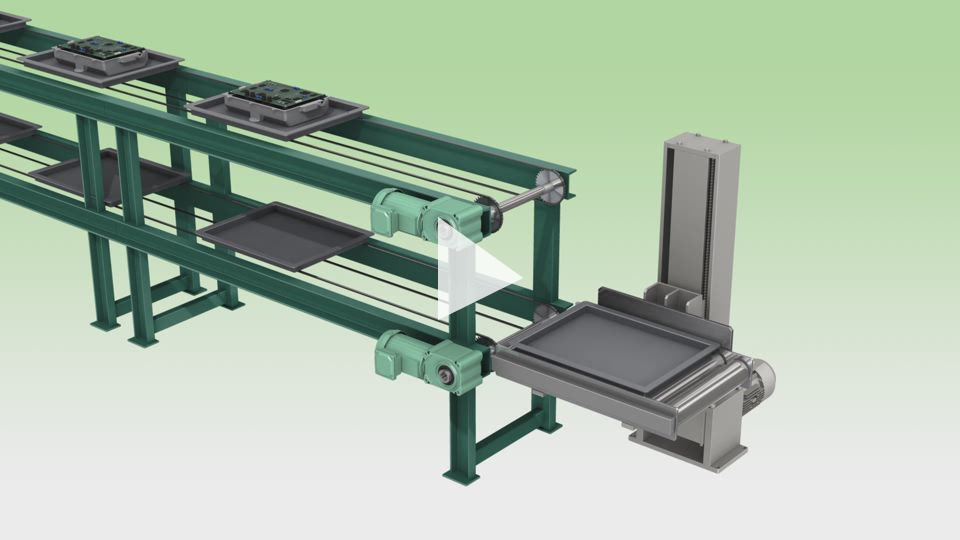부품을 공급 컨베이어에서 조립 작업대로 승강시켜 작업자가 조립 작업을 수행합니다. 작업자의 허리 높이까지의 현기증 공간에도 설치 가능한, 츠바키의 짚 체인 액추에이터가 사용되고 있습니다.
