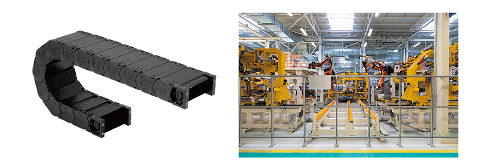 로봇은 장스트로크로 횡행하는 경우가 많아, 케이블 베이어의 마모를 억제해, 장수명화를 도모하기 위해 TKC형, TKMT형 등의 롱스팬 사양・ 슬라이드 슈 시리즈도 사용되고 있습니다.