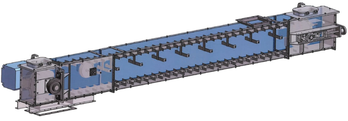 케이싱 내부를 주행하는 체인의 움직임으로 인해 원료는 수류처럼 부드럽게 운반되며 수평 또는 완만한 경사 배치에 사용하기에 적합합니다.
