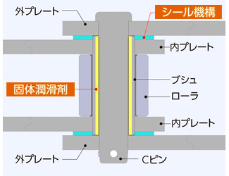 핀과 부시 사이에는 고체 윤활제를 고정하고, 또한 링크 사이에는 O링을 배치함으로써 반송물이 링크 기구 내부로 침입하는 것을 방지합니다.