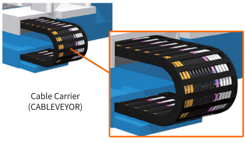 볼 나사와 서보 모터의 연결에는 필요에 따라 선택 가능한 커플링과 장치 이동에 따른 케이블 호스를 확실히 지지 안내하는 케이블 베이어가 사용되고 있습니다.
