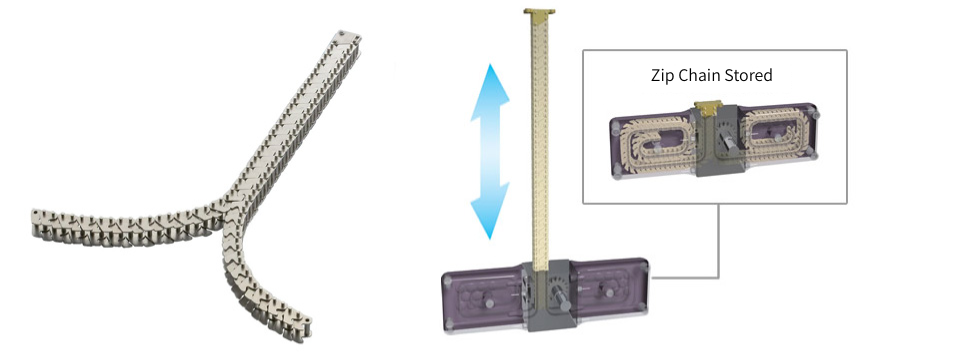 짚 체인 이란, 2개의 체인이 지퍼와 같이 맞물려, 1개의 견고한 기둥 형상이 되어 「밀기・끌어당김」을 할 수 있는 당사 독자 개발의 체인입니다.