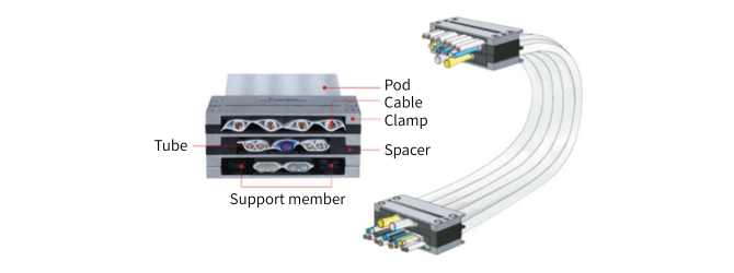 케이블이나 튜브, 서포트 멤버를 전용의 불소 수지제 포드 내에 수납하는 것으로 마모분의 비산을 방지해, 츠바키 케이블 베이어 시리즈 중에서 가장 저발진으로, ISO 클래스 1을 실현합니다. 생산 설비의 품질에 대한 신뢰성 향상을 도모할 수 있습니다.