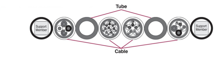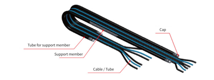 튀어 오름 억제, 장스트로크를 실현하는 서포트 멤버는 튜브에 내장. 케이블·튜브는 평형에 용착한 구조이기 때문에, 저발진을 실현합니다.