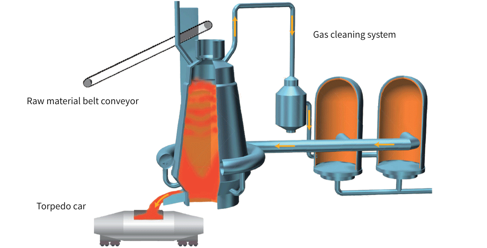 철광석에서 철을 만드는 설비입니다. 퍼니스의 상단에서 철광석과 코크스를 번갈아 넣고 퍼니스의 하부에서 열풍을 불어 넣습니다. 코크스의 연소에 의해 발생한 CO2 가스로 철광석이 환원되어 철이 됩니다. 퍼니스의 온도는 2000°C에 이르며 퍼니스 아래에서 녹은 철 (용선)으로 꺼내집니다.