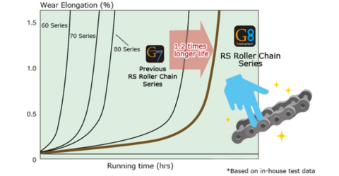 창업 100년의 고비에, 신뢰와 실적의 츠바키 RS 롤러 체인「G7-EX」를 한층 더 리뉴얼해, 8세대의 RS 롤러 체인 으로서 「G8」시리즈를 라인 업했습니다. 취급성 향상을 목적으로 새로운 윤활유를 채용하여 체인의 끈적임 억제와 동시에 내마모성이 기존 대비 20% 향상되었습니다.