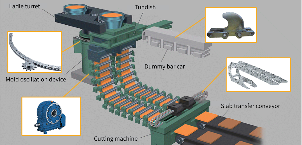 전로에서 꺼낸 용강은 팬에서 하단 금형으로 연속적으로 흘러 들어가 냉각됩니다. 차가워지고 굳어진 강철은 미리 정해진 길이로 절단되어 압연 공정으로 운반되어 다양한 형태로 가공됩니다.