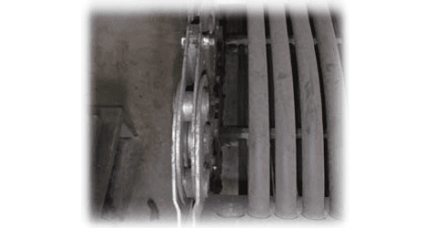 리클레이머용 체인은, 부시~롤러간이나 사이드롤러 내부에 마모성 개재물이 침입해, 롤러의 회전 불량이나 부쉬~롤러간의 마모가 일어나, 수명이 됩니다.