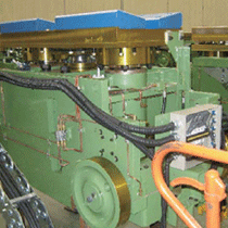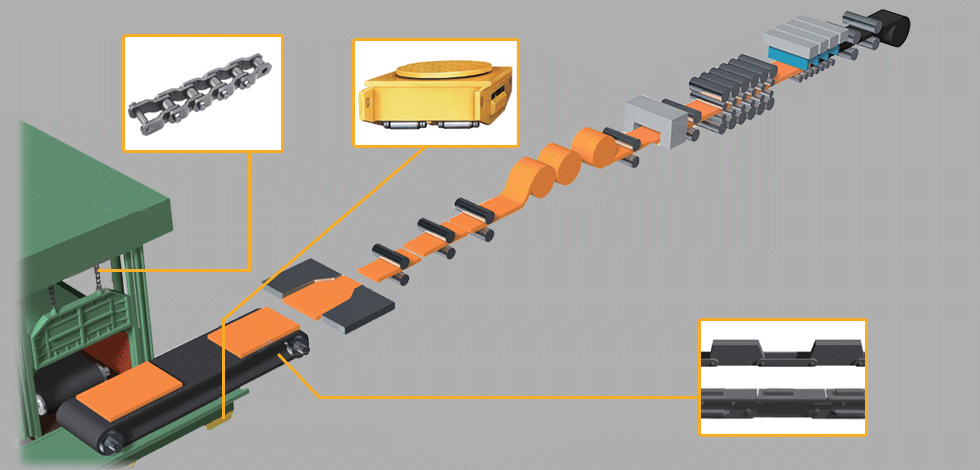 CAL이나 CGL을 비롯한 강판의 표면 처리 라인에서는, 연속으로 표면 처리를 실시하기 위해, 입측에서는 코일과 코일의 이음매를 용접하거나, 출측에서는 코일 권취 후의 컷 등을 하거나, 불연속적인 흐름이 될 때에 루프 타워의 캐리지를 승강시켜, 축적한 강판을 부드럽게 보내 줍니다. 캐리지의 승강에서는 신뢰와 실적의 강력 드라이브 체인 G8 시리즈가 활약하고 있습니다.