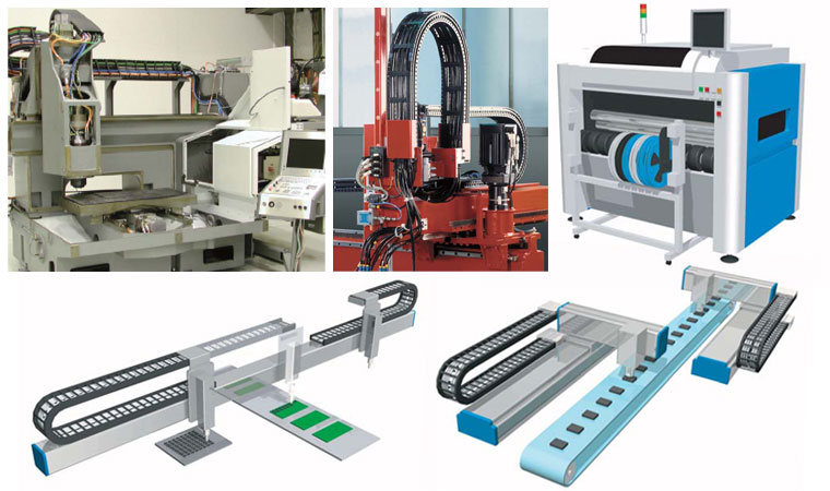 액정이나 반도체의 제조 공정에 사용되는 각종 장치나, 프린트 기판에 전자 부품을 실장하는 장치(칩 마운터)에 케이블 베이어가 채용되고 있습니다.