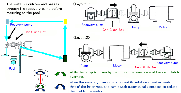 캠 클러치 박스는 모터가 펌프를 운전하고 있는 상태에서는 공전을 실시합니다. 복구 펌프