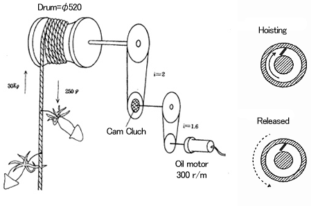 유압 모터를 일정 속도로 역전시키면 드럼은 와이어의 자중이나 파에 의해 당겨집니다. 와이어가 당겨지는 속도가 모터의 회전 속도보다 빨라지면 캠 클러치가 맞물립니다.