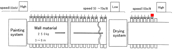 | ① 도장부에서 외벽재는 커튼 모양으로 떨어지는 세라믹 도료를 일정한 속도로 통과한다. | ②다음에 건조로에 들어가기 위해 컨베이어 속도는 느려진다. | ③건조로를 통과한 외벽재는 속도를 빨리 다음 공정으로 흘린다. | |||