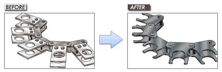 지그를 체인과 일체화시킴으로써, 판금의 가공이나 설치, 설계에 필요한 공수를 삭감.조달처의 단일화나 장치의 슬림화, 위치결정 정밀도의 향상에도 공헌.