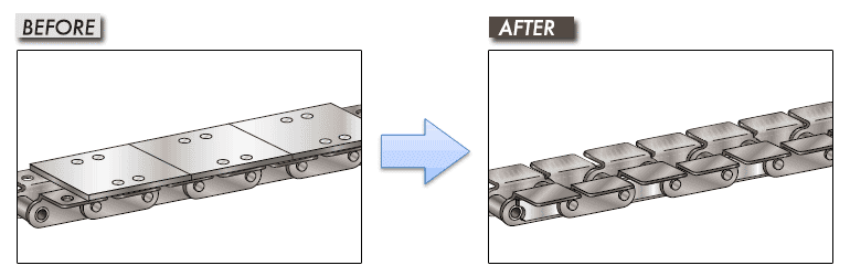어태치먼트에 용접판(슬랫)을 볼트로 체결한 사양에 체인과 용접판을 일체화시킨 복합형을 제안.