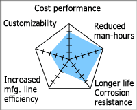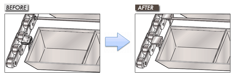 표준 체인에 버킷과 바를 용접하여 사용하고 있는 곳에 특수 어태치먼트 부착 체인을 제안. 버킷과 바를 간단하게 설치할 수 있게 됨으로써 용접 공수를 삭감. 체인의 장수명화에도 공헌.