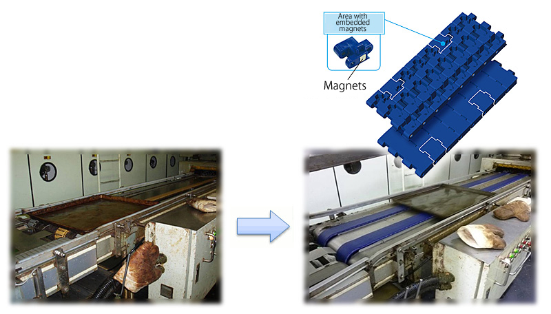 체인 내부에 자석을 포함한 플라스틱모듈러체인 BTM8H-M을 제안. 자석의 자력으로 트레이를 유지하고 트레이의 미끄러짐을 해소했습니다.