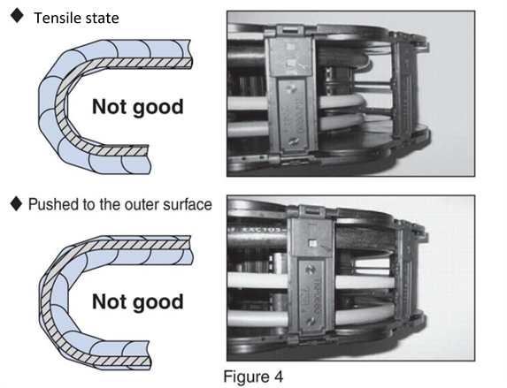 ■케이블・호스는 굴곡부에서 인장 마음이나 케이블 베이어 외주면에 밀어붙인 상태가 되지 않도록, 풀어 기색(케이블 베이어 베어 내주면보다 떠오름)에, 자유롭게 움직일 수 있도록 배선해 주세요. (그림 3 · 그림 4 참조)
