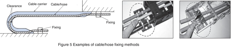 ■ 케이블 호스에 불필요한 장력이 작용하지 않도록 케이블 베이어 내에서 길이를 유지하기 위해 이동단 및 고정 단부에서 고정 (클램프)하십시오. (그림 5 참조)